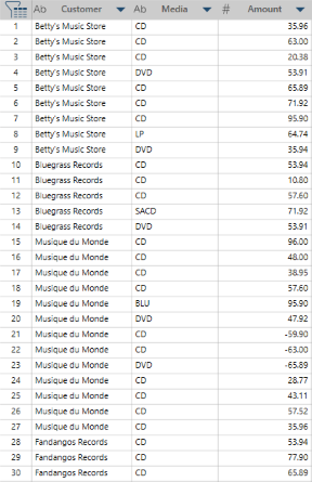 When selecting which column to pivot, think of the column that can best summarize your data (i.e., yield the most compact table) and give you the information you need. In the example above, the table includes 13 customers, 5 media types, and 91 different amounts. If you want to answer the question, "Which customer bought the most (in terms of amount) of a specific media type," you can select either Customer or Media Qty as the column to pivot. However, choosing the former yields a table with 13 columns, whereas choosing the latter yields a table with only 5 columns. Thus, choosing Media Qty as the column to pivot may be the more logical action.