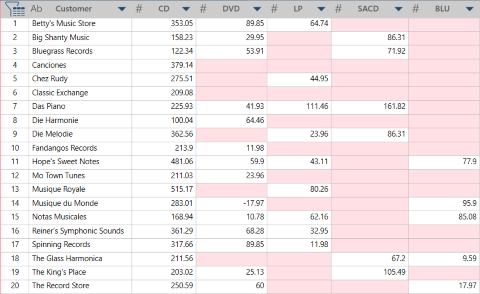 Similar to Step 5, thinking of the column to use as values requires some consideration of the information you are trying to obtain. Recall that we are trying to answer the question, "Which customer sold the most (in terms of amount) of a specific media type" in Step 5. Since we want to find out how much each customer bought, we use Amount as the values column.