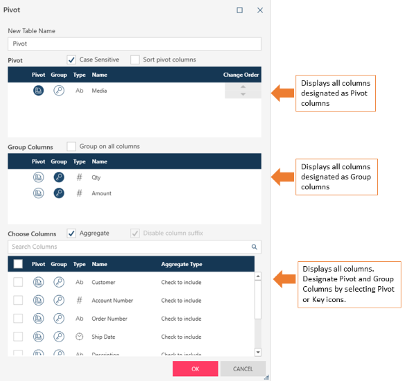 As discussed earlier, columns you select as pivot or group columns are moved to the corresponding (Pivot or Group) section on the Pivot dialog. Also, note that the icon for pivot or group is highlighted to indicate the column's role in the transform: