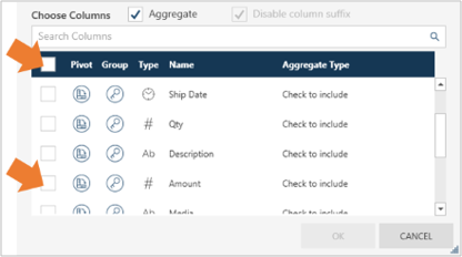 To select a pivot column, select the pivot icon beside a column on the Choose Columns section of the dialog box.