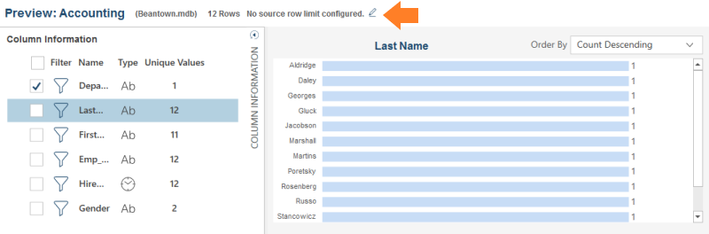 You can limit the number of rows to work with by selecting the Edit icon beside No Source Limit Configured: