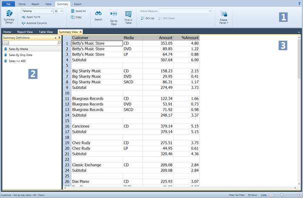 Displays all the tools you need to work with a report. Refer to the Summary View Ribbon Quick Reference. |