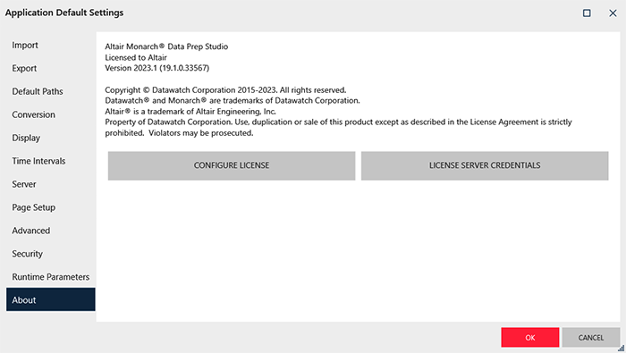 Displays relevant information related to your Monarch Data Prep Studio application, including the version number and Altair and Datawatch copyright notices.