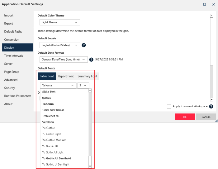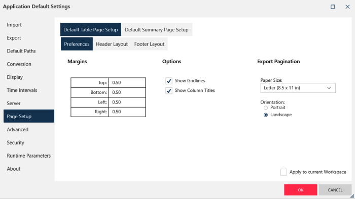 You can specify page header/footer settings for tables and summaries and apply the same to all tables/summaries in the current workspace. Selecting the Apply to current Workspace check box applies all of your settings to any open workspace.