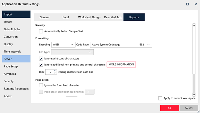 Use this setting to specify the default report file format. The following encodings are supported by Monarch Data Prep Studio: