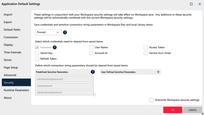 This setting tells Monarch Data Prep Studio what to do with passwords and sensitive connection string parameters from data sources and connections in workspace files and local library items. This setting only affects local workspace and library save behavior.