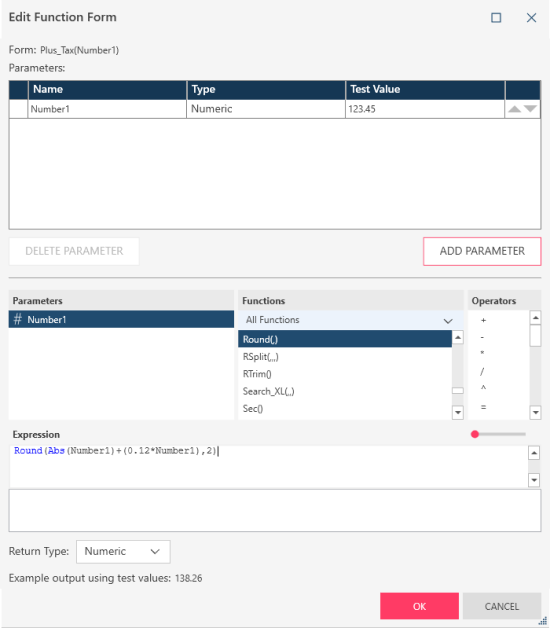 - Build the function in the Expression box. For example, if you wish to calculate any the gross amount of any number net of 12% tax rounded to two digits, you could create the expression "Round(Abs(Number1)+(0.12*Number1),2)."