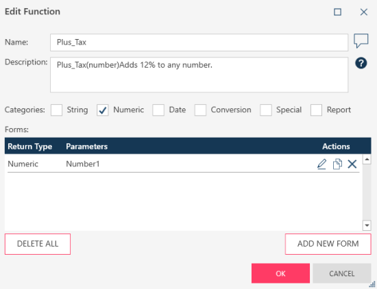 in the Functions column. The Edit Function dialog displays. - Supply a name for your function as well as a description for it. Adding a description will help other users understand what the function is for. You can enable syntax highlighting for parameters by using HTML-style tags. For example, if your function has the form "YearsBetween(startdate,enddate)," you could format your description as "Returns the number of years between <1>startdate</> and <2>enddate</2>."