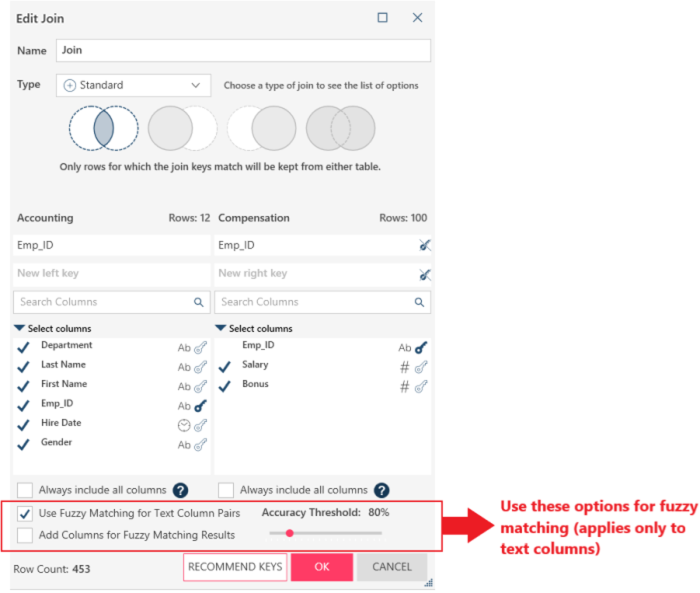 Monarch Data Prep Studio makes an allowance for potential errors in spelling that would result in a mismatch even when the keys are highly similar (e.g., "bond" vs. "bund") during a join operation.
