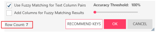 The accuracy threshold reflects the percentage of similarity between two strings. When the accuracy threshold is set to 100% (i.e., all rows must match perfectly), only 7 out of 10 rows will match, which we already expect. Moving the slider for this setting to 90% (i.e., up to 10% of the strings may be dissimilar) changes the row count of the resulting table to 9, which means one of the three differences we identified above may be accepted in the join operation. In fact, moving the slider all the way to 0% will result in only 9 rows matched.