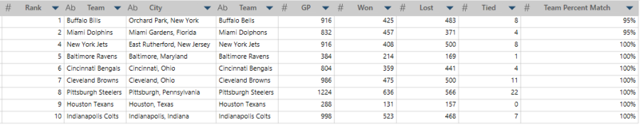 The table on the left contains the rank, names, and cities of the top 10 National Football League teams, and the table on the right specifies the game records of these teams. If we wanted to join these tables using "Team" as a key, the rows for the New England Patriots, Miami Dolphins, and Buffalo Bills would not match between tables because of misspellings in the right-hand table. To match these rows as best as possible, we will need to employ fuzzy matching.