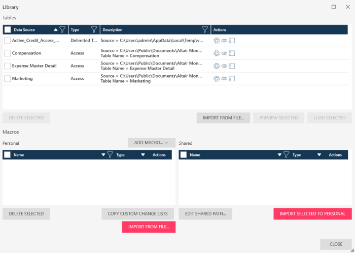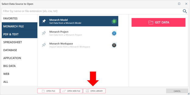 When you save a data source to the library, Monarch Data Prep Studio also preserves path or location of the source. You can then use the library to easily access and include commonly-used data sources as you define workspaces, without having to open the data source and load tables.