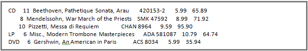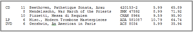 Note: Only fixed-pitch fonts are available in the Report window, since their use would cause columns to be misaligned when printed. (Monarch Classic allows proportional-pitch fonts in the Table and Summary windows, however.) For example, the following illustration shows the effect of using a proportional-pitch font versus a fixed-pitch font to print several columns of report data.