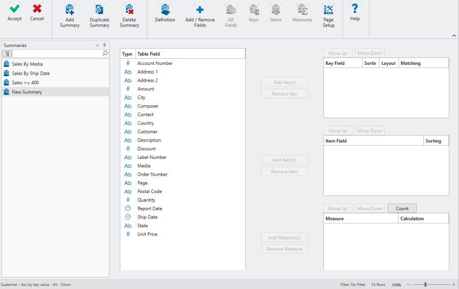 A summary tabulates information for selected fields and presents the results in a one or two dimensional matrix. The most basic summary requires a single key field and a single measure. However, you can create summary reports that include multiple key fields and multiple measures. You can also include item fields to display individual transactions and you can designate a filter to apply when displaying the summary. A host of display options lets you sort the summary, add subtotals, and format your summary report for easier viewing.