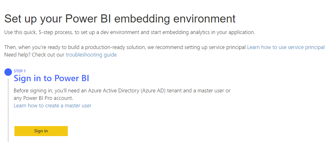 Sign in using your Power BI account in Step 1 of the Embedding Setup tool, and then click Next.