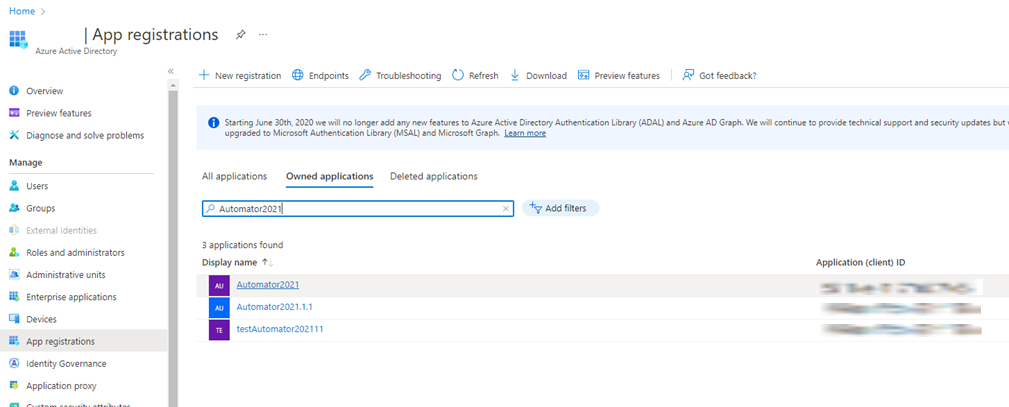 In the Owned applications tab, click the display name of your registered app (e.g., Automator2021) to view its properties, including the Application ID generated previously.