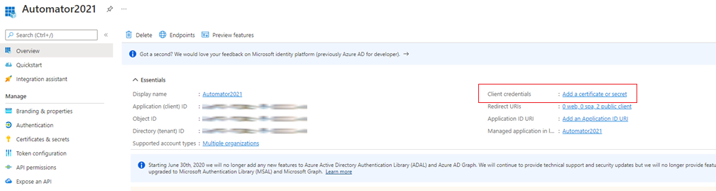 Navigate to page of the registered application by clicking its corresponding name from the list of App registrations.