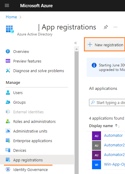 Navigate to App registrations and click the New Registration button. Proceed with the registration of your application.