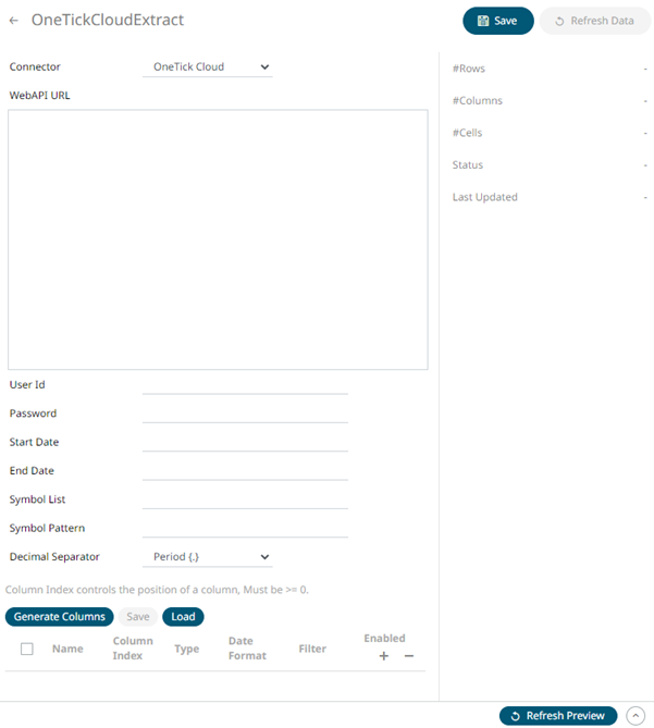 1. On the New Data Extract page, select OneTick Cloud in the Connector drop-down list.