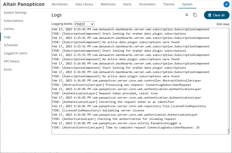 View the latest 300 rows of a Logging Level in the Logs tab: