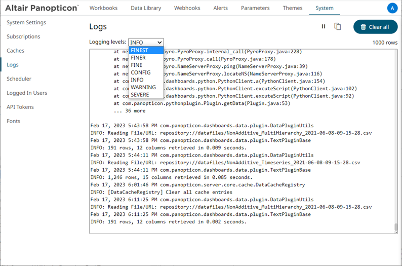 The latest 1000 rows of the selected log level or higher are fetched.