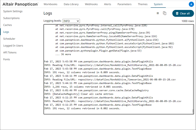 1. On the System page, click the Logs tab. Initially, the default level (INFO) logs are displayed.