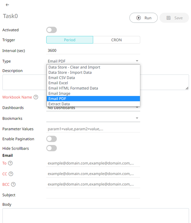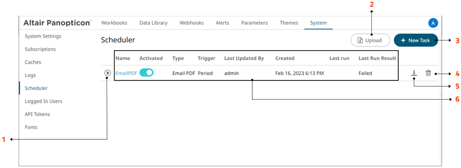 Task Properties The task properties include: · Name of the task · Activated status · Type of the scheduled task · Trigger type: Period or CRON · Last user who made an update · Date/Time when the task was created · Date/Time when the task was last ran · Last run result: Success or Failed For failed results, you can hover on the tooltip to view the error. NOTE: The result is not displayed for Extract Data scheduler type. |