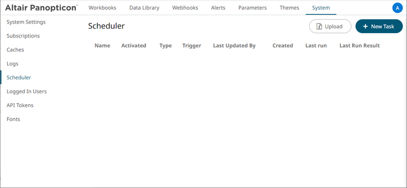 On the Scheduler tab of the System Settings page, Panopticon Real Time allows scheduling of tasks.