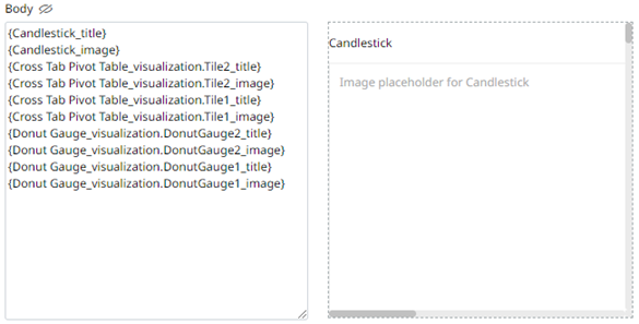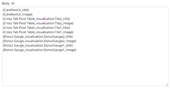 The selected dashboards or parts are inserted as parameterized text and inline images in the Body edit box.