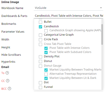 · Select dashboards or parts to include in the image file by checking their corresponding boxes in the Dashboards & Parts drop-down list.