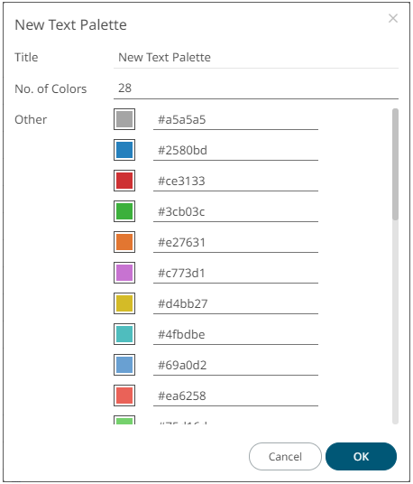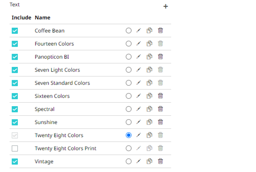 In the Web Authoring, when a text column is added to the Color variable, the configuration pane displays the color associated with each categorical item, as specified with a default color palette (e.g., Twenty Eight Colors).