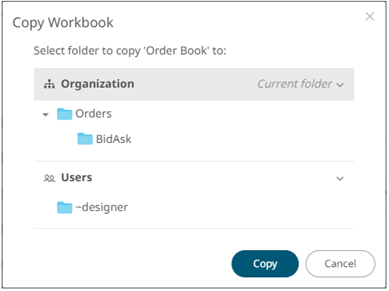 The Copy Workbook dialog displays with the folder or subfolders the user is allowed to copy the workbook to.