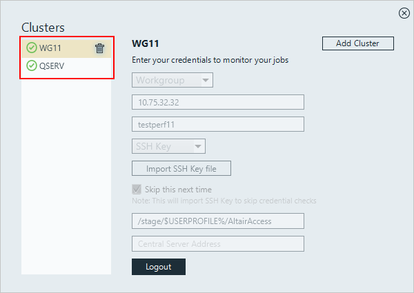 Delete a Cluster Remove a cluster when you no longer want to submit and manage jobs on that cluster. Open the Windows system tray. Double-click the Access Desktop icon . Click . Select Clusters from the menu. A list of clusters that are registered and available is displayed. Figure 1. Clusters Find the cluster you want to remove and click next to its name. The cluster is removed.