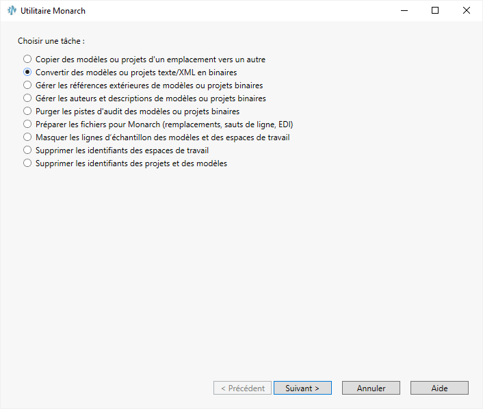Choisissez Démarrer > Tous programmes > Altair Monarch 2023 > Utilitaire Monarch 2023 pour lancer l'utilitaire et sélectionnez l'option Convertir des modèles ou projets texte/XML en Binaire dans l'assistant qui s'affiche. Cela fait, cliquez sur Suivant.