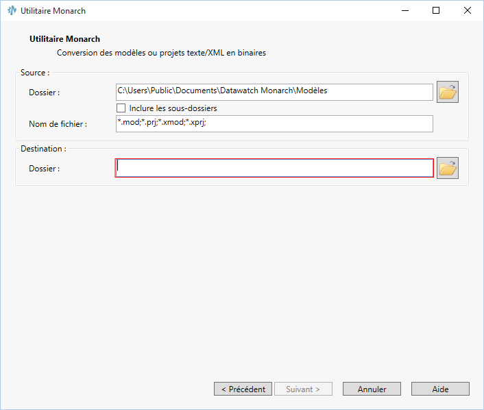 L’Utilitaire Monarch offre un mode de conversion des anciens formats de modèle et de projet (xmod, xprj) aux formats .dmod et .dprj sans qu’il soit nécessaire d’ouvrir chaque modèle et projet dans Monarch. Le traitement des données en est d’autant plus rapide.