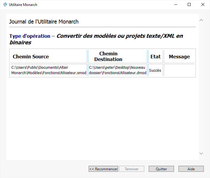 Ce journal affiche les chemins sources des modèles texte/XML convertis, les chemins de destination des modèles au format binaire, un message d'état indiquant le succès ou l'échec de la tâche et, au besoin, un message d'erreur.