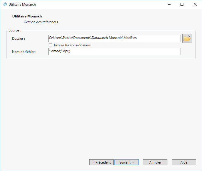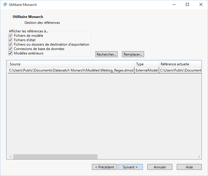 L’Utilitaire Monarch permet de gérer les références extérieures de modèles ou projets binaires. Par exemple, si un modèle particulier contient une référence à une base de données Access et que l’emplacement de cette base de données a changé, l’Utilitaire Monarch permet d’actualiser la référence dans le modèle.