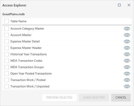 Note that when some file types, such as Microsoft Access and Excel, are used as data sources, a dialog, also referred to as an explorer, displays to ask you to specify other options prior to loading the data to your workspace.