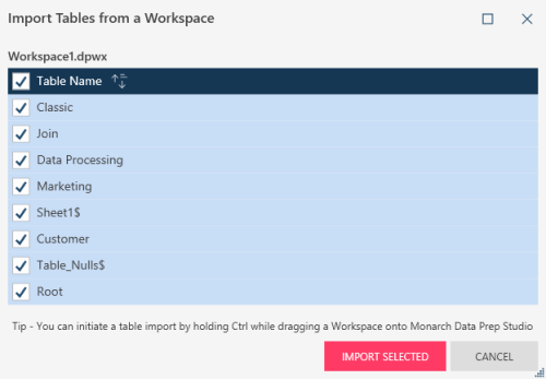 If the workspace contains a single (child) table, this table (and its parent tables) is added to your workspace. Otherwise, the Import Tables from a Workspace dialog displays. Use this dialog to select which of the tables in the workspace should be added to your currrent workspace.