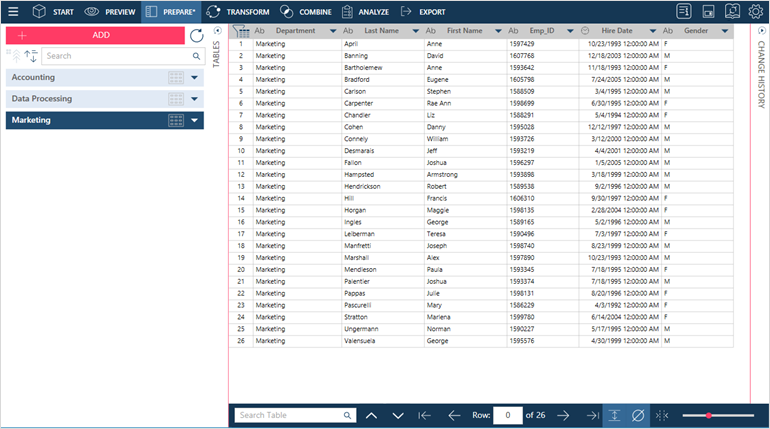 Drag a file to the Prepare Window. This action immediately loads the data to your Prepare window.