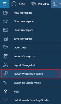 Click on the application menu icon on the upper left-hand corner of your screen and then select Import Workspace Tables from the options that display.