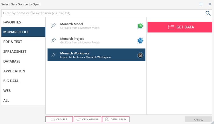 Alternatively, in the Start, Preview, or Prepare windows, select Open Data (in the Start page), New (in the Preview window) or Add (in the Prepare window) to launch the Select Data Source to Open dialog. Using this dialog, select Monarch File > Monarch Workspace > Get Data.