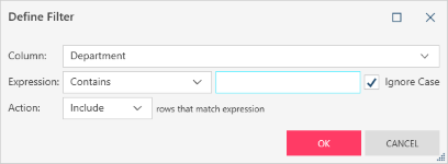 The column you selected automatically displays in the Column field of the dialog. If you wish to change this column, you can use the drop-down that displays to the right of the field to do so. If you select a cell value and then start a new filter, the field to the left of the Expression field is pre-populated with this value.