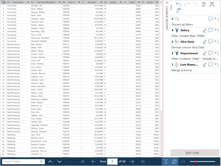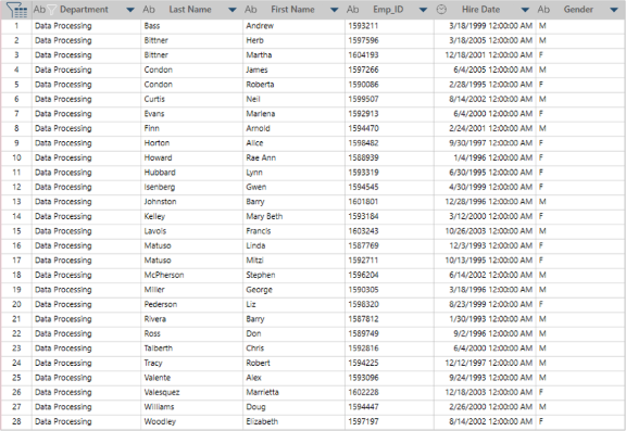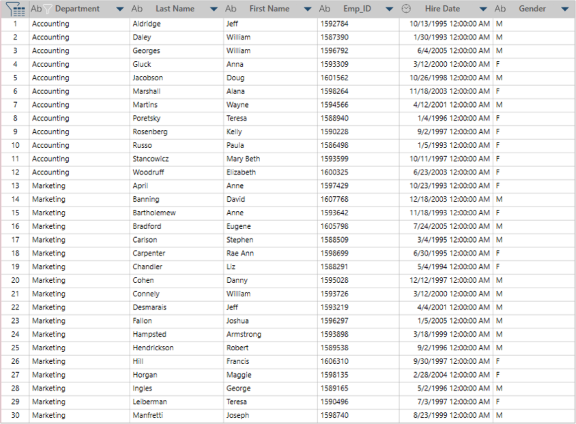 In the example below, the results of the filter defined by the image in Step 3 are displayed. Here, the original table contains the values "Accounting," "Data Processing," and "Marketing" in the Department field.