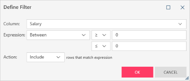 On the Prepare Window, select a table, right-click on a column you want to filter on, and select Filter > Define Filter. The Define Filter dialog displays.