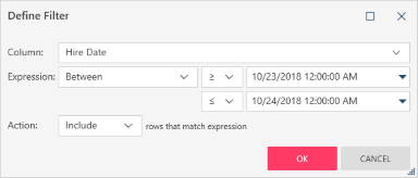 Between - This filter operator allows you to define date/time ranges; when this operator is selected, you must also select one from each of two sets of operators (i.e., greater than/greater than or equal to and less than/less than or equal to) to identify the range to filter for.
