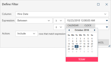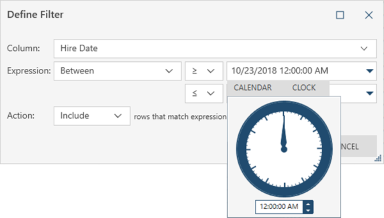 You can specify calendar and/or clock values when creating date/time filters. To do so, click on the drop-down buttons provided beside the date/time fields in the Apply (Date/Time) Filter dialog and then click Calendar or Clock.