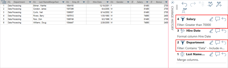 Filters are recorded in the Change History panel. This means you can easily review or change a filter editions from the Change History List as well.
