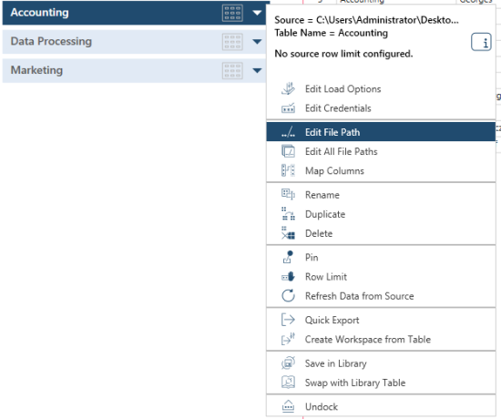 In the Prepare Window, click the drop-down arrow beside your table of interest and then select Edit File Path.