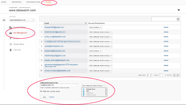 The administrator grants permissions to the user in the Admin > User Management page in their Google Analytics account.